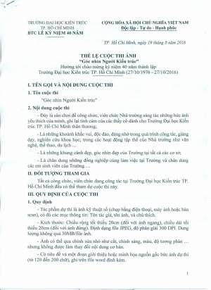 Hướng tới chào mừng kỷ niệm 40 năm thành lập Trường Đại học Kiến trúc TP.Hồ Chí Minh (27/10/1976 - 27/10/2016). Ban tổ chức Lễ kỷ niệm 40 năm tổ chức Cuộc thi ảnh "Góc nhìn Người Kiến trúc" đến toàn thể công chức, viên chức Nhà trường.