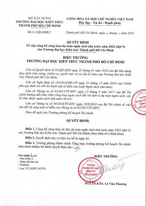 Quyết định số 881/QĐ-ĐHKT về việc công bố công khai dự toán ngân sách nhà nước năm 2022 (đợt 5) của Trường Đại học Kiến trúc Thành phố Hồ Chí Minh