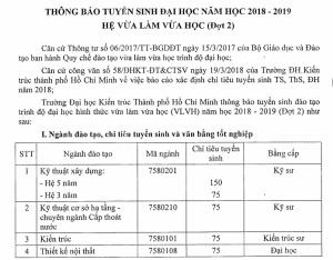 Trường Đại học Kiến trúc TP. Hồ Chí Minh thông báo tuyển sinh Đại học hệ Vừa làm vừa học năm học 2018 - 2019 [Đợt 2] cho các chuyên ngành: Kỹ thuật xây dựng, Kỵ thuật cơ sở hạ tầng - chuyên ngành cấp thoát nước, Kiến trúc, Kiến trúc nội thất.