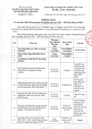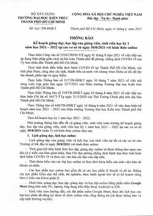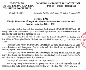Thông báo số 544/TB-ĐHKT ngày 13/8/2021 của Trường Đại học Kiến trúc Thành phố Hồ Chí Minh về việc điều chỉnh kế hoạch đào tạo Khóa 2021 học kỳ 1 năm học 2021 - 2022