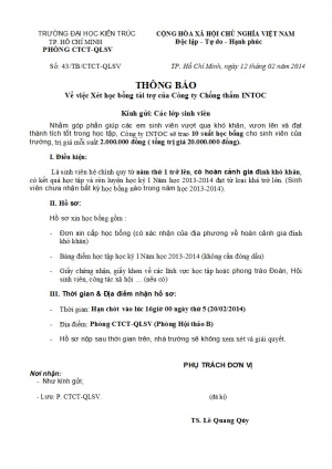 Nhằm góp phần giúp các sinh viên vượt qua khó khăn, vươn lên và đạt thành tích tốt trong học tập, Công ty INTOC sẽ trao 10 suất học bổng cho sinh viên Trường Đại học Kiến trúc TP.Hồ Chí Minh, trị giá mỗi suất 2.000.000 đồng (tổng trị giá 20.000.000 đồng).