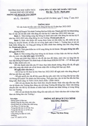 Thông báo số 51/TB-KHTC của Phòng Kế hoạch Tài chính - Trường Đại học Kiến trúc Thành phố Hồ Chí Minh về mức thu và thời gian thu học phí học kỳ II năm học 2023-2024 (Dành cho sinh viên hệ chính quy, hệ vừa làm vừa học)
