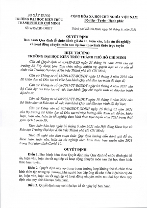 Quyết định số 475a/QĐ-ĐHKT ngày 30/6/2021 của Trường Đại học Kiến trúc Thành phố Hồ Chí Minh về Ban hành Quy định tổ chức đánh giá đồ án, luận văn, luận án tốt nghiệp và hoạt động chuyên môn sau đại học theo hình thức trực tuyến.