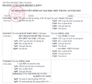 Hội đồng Tuyển sinh Sau đại học đợt tháng 10 năm 2019 - Trường Đại học Kiến trúc TP. Hồ Chí Minh công bố lịch thi tuyển sinh.