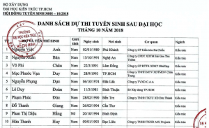 Hội đồng tuyển sinh Sau Đại học - trường Đại học Kiến trúc TP. Hồ Chí Minh thông báo danh sách thí sinh dự tuyển sinh Sau Đại học đợt tháng 10 năm 2018.