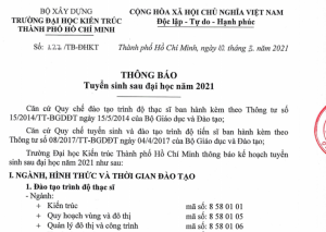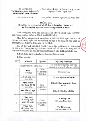 Thông báo số 608/TB-ĐHKT ngày 27/9/2021 của Trường Đại học Kiến trúc Thành phố Hồ Chí Minh về Hình thức thi tuyển sinh trình độ thạc sĩ đợt tháng 10 năm 2021