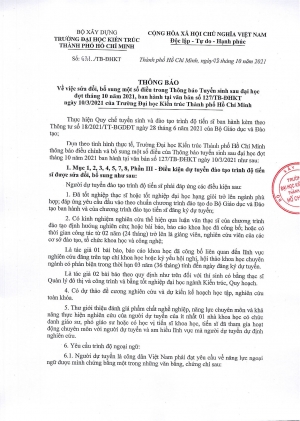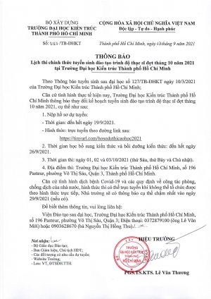 Thông báo số 631/TB-ĐHKT ngày 08/10/2021 về việc sửa đổi, bổ sung một số điều trong Thông báo Tuyển sinh sau đại học đợt tháng 10 năm 2021, ban hành tại văn bản số 127/TB-ĐHKT ngày 10/3/2021 của Trường Đại học Kiến trúc Thành phố Hồ Chí Minh. -