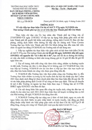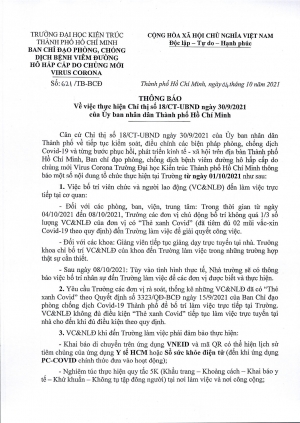 Thông báo số 618/TB-BCĐ ngày 04/10/2021 của Trường Đại học Kiến trúc Thành phố Hồ Chí Minh về việc thực hiện Chỉ thị số 18/CT-UBND ngày 30/9/2021 của Ủy ban nhân dân Thành phố Hồ Chí Minh