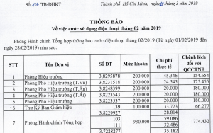 Nhà trường thông báo cước phí sử dụng điện thoại tháng 02 năm 2019. Các đơn vị và cá nhân có nhu cầu chi tiết cước điện thoại, vui lòng liên hệ phòng Hành chính tổng hợp và phòng Kế hoạch tài chính để được cung cấp.