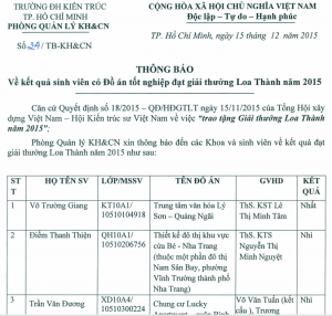 Kết quả sinh viên có Đồ án tốt nghiệp đạt giải thưởng Loa Thành năm 2015
