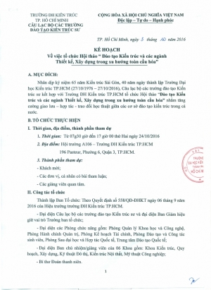 Nhân dịp kỉ niệm 65 năm Kiến trúc Sài Gòn, 40 năm ngày thành lập trường (27/10/1976- 27/10/2016), họp mặt Câu lạc bộ các trường Đào tạo Kiến trúc sư, Trường Đại học Kiến trúc TP.Hồ Chí Minh tổ chức Hội thảo "Đào tạo Kiến trúc và các ngành Thiết kế, Xây dựng trong xu hướng toàn cầu hóa".