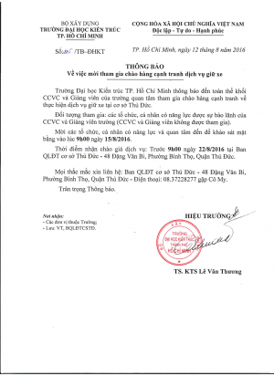 Trường Đại học Kiến trúc thông báo đến toàn thể khối CCVC và Giảng viên quan tâm tham gia chào hàng cạnh tranh về thực hiện dịch vụ gửi xe tại cơ sở Thủ Đức.