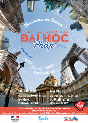 "Ngày hội Giáo dục Đại học Pháp 2015 - Bienvenue en France !" tại Thành phố Hồ Chí Minh vào thứ bảy ngày 10/10/2015 và tại Hà Nội vào Chủ nhật ngày 11/10/2015.