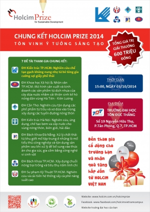 Vòng Chung kết Holcim Prize 2014 sẽ diễn ra lúc 15 giờ, ngày 03 tháng 10 năm 2014 tại Trường Đại học Tôn Đức Thắng (số 19 Nguyễn Hữu Thọ, phường Tân Phong, quận 7, TP.HCM).