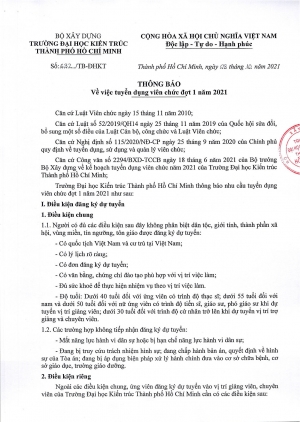 Thông báo số 692/TB-ĐHKT ngày 03/11/2021 của Trường Đại học Kiến trúc Thành phố Hồ Chí Minh về việc nộp hồ sơ dự tuyển viên chức đợt 1 năm 2021