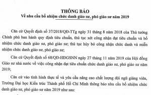 Căn cứ tình hình thực tế và yêu cầu nâng cao chất lượng đội ngũ giáo viên, Trường Đại học Kiến trúc TP. Hồ Chí Minh thông báo nhu cầu bổ nhiệm chức danh giáo sư, phó giáo sư năm 2019.