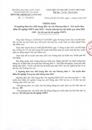 Thông báo số 673/TB-HĐTS về ngưỡng đảm bảo chất lượng đầu vào của Phương thức 5 - Xét tuyển theo điểm tốt nghiệp THPT năm 2022 - Tuyển sinh đại học hệ chính quy năm 2022 (100 - Xét kết quả thi tốt nghiệp THPT)