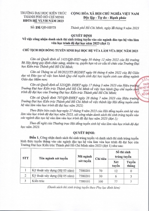 Quyết định số 878/QĐ-HĐTS ngày 28/9/2023 về việc công nhận danh sách thí sinh trúng tuyển vào các ngành đào tạo hệ vừa làm vừa học trình độ đại học năm 2023 (đợt 1)