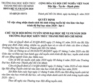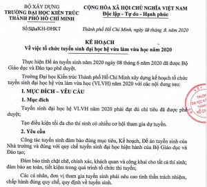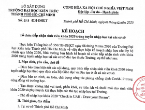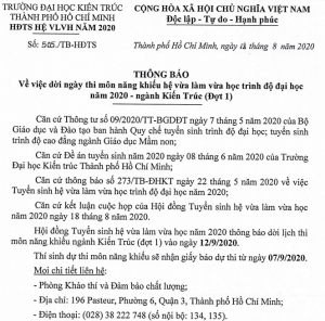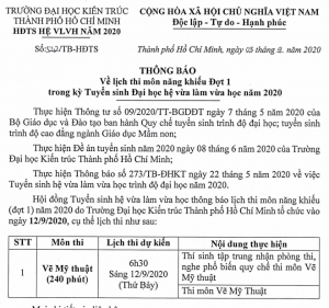 Hội đồng Tuyển sinh hệ vừa làm vừa học năm 2020 thông báo dời lịch thi môn năng khiếu ngành Kiến Trúc (đợt 1) vào ngày 12/9/2020.