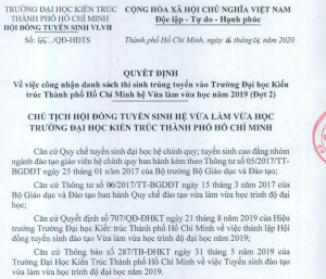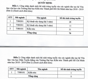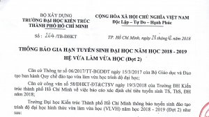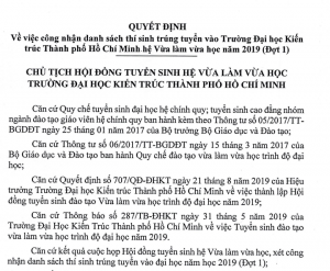 Hội đồng tuyển sinh Hệ vừa làm vừa học Trường Đại học Kiến trúc TP. Hồ Chí Minh thông báo danh sách trúng tuyển Đợt 2, năm học 2018-2019.